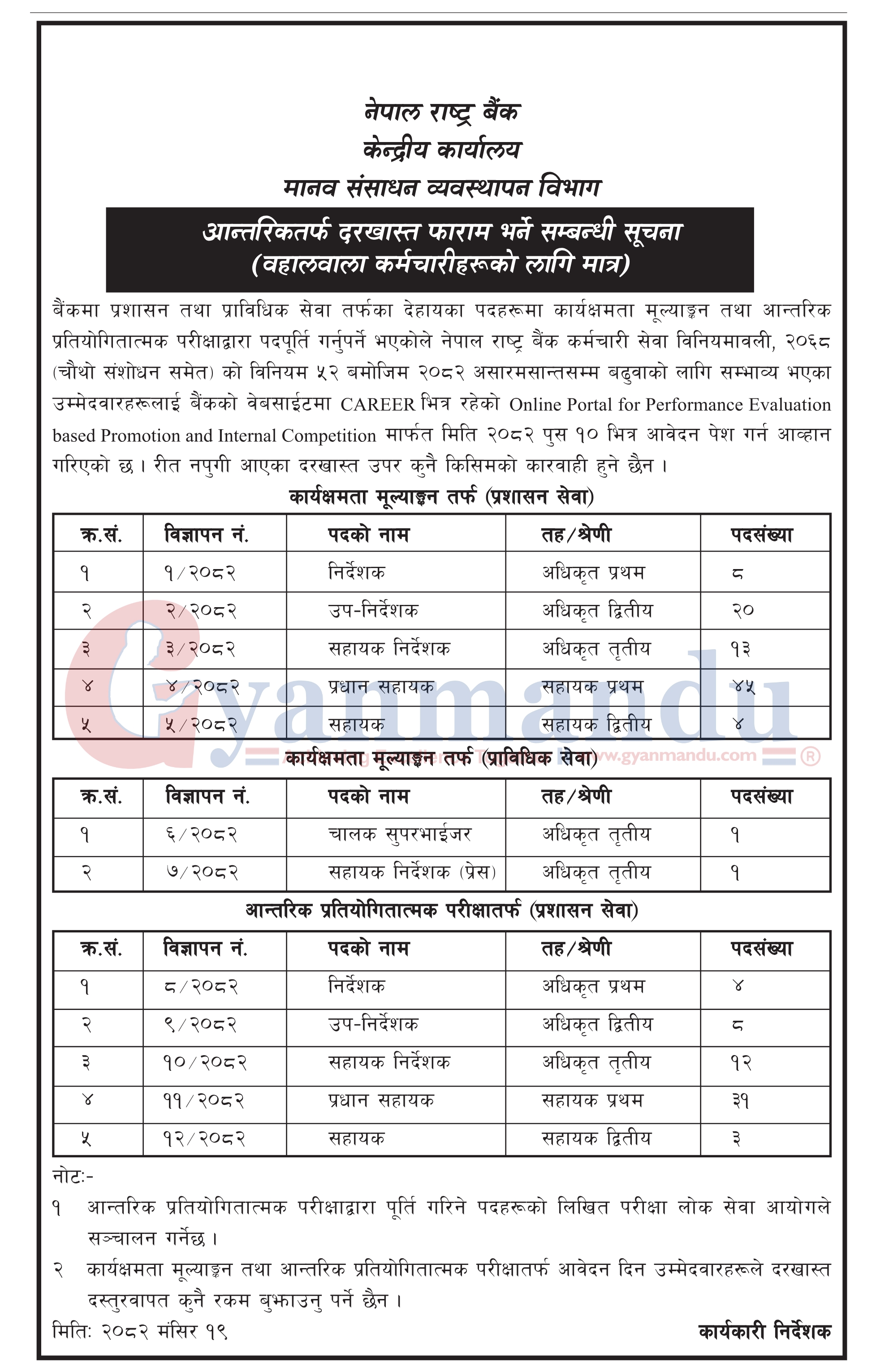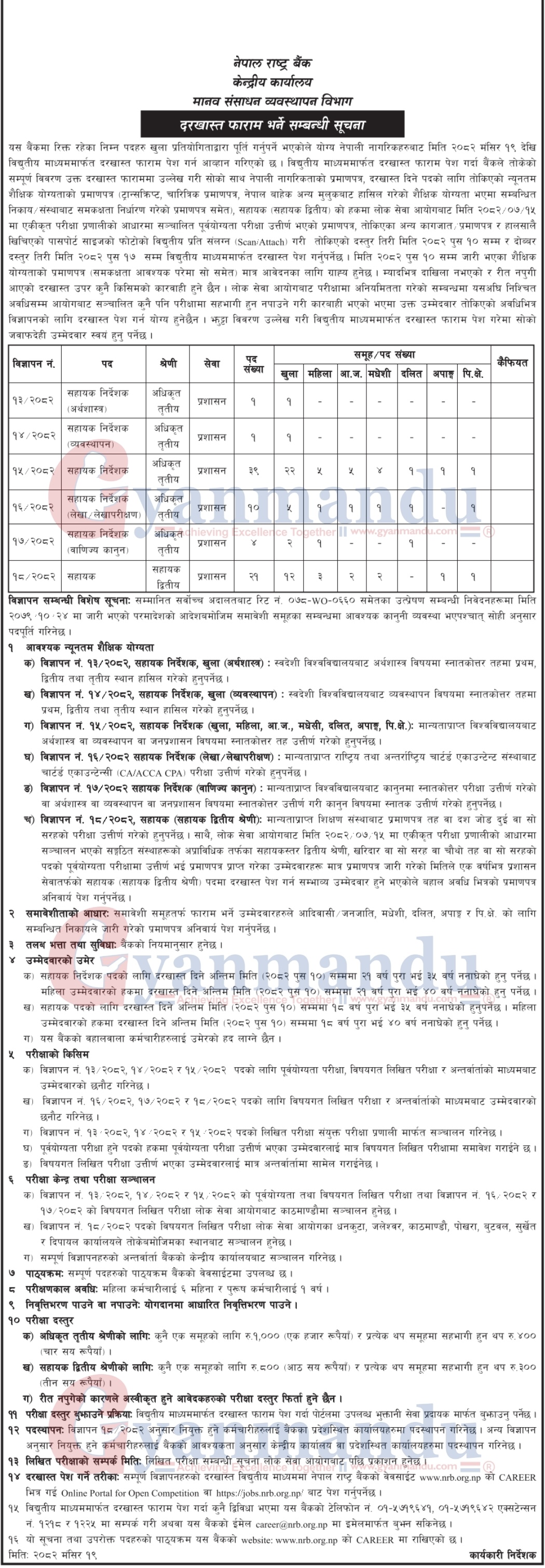 नेपाल राष्ट्र बैंकमा रिक्त रहेका निम्न पदहरु खुला प्रतियोगिताद्वारा पूर्ति गर्नुपर्ने भएकोले योग्य नेपाली नागरिकहरुबाट मिति २०८२ मंसिर १९ देखि विद्युतीय माध्यममार्फत दरखास्त फाराम पेश गर्न आव्हान गरिएको छ । विद्युतीय माध्यममार्फत दरखास्त फाराम पेश गर्दा बैंकले तोकेको सम्पूर्ण विवरण उक्त दरखास्त फाराममा उल्लेख गरी सोको साथ नेपाली नागरिकताको प्रमाणपत्र, दरखास्त दिने पदको लागि तोकिएको न्यूनतम शैक्षिक योग्यताको प्रमाणपत्र (ट्रान्सक्रिप्ट, चारित्रिक प्रमाणपत्र, नेपाल बाहेक अन्य मुलुकबाट हासिल गरेको शैक्षिक योग्यता भएमा सम्बन्धित निकाय/ संस्थाबाट समकक्षता निर्धारण गरेको प्रमाणपत्र समेत), सहायक (सहायक द्वितीय) को हकमा लोक सेवा आयोगबाट मिति २०८२/०७/१५ मा एकीकृत परीक्षा प्रणालीको आधारमा सञ्चालित पूर्वयोग्यता परीक्षा उत्तीर्ण भएको प्रमाणपत्र, तोकिएका अन्य कागजात प्रमाणपत्र र हालसालै खिचिएको पासपोर्ट साइजको फोटोको विद्युतीय प्रति संलग्न (Scan Attach ) गरी तोकिएको दस्तुर तिरी मिति २०८२ पुस १० सम्म र दोब्बर दस्तुर तिरी मिति २०८२ पुस १७ सम्म विद्युतीय माध्यममार्फत दरखास्त पेश गर्नुपर्नेछ । मिति २०८२ पुस १० सम्म जारी भएका शैक्षिक योग्यताको प्रमाणपत्र ( समकक्षता आवश्यक परेमा सो समेत) मात्र आवेदनका लागि ग्राह्य हुनेछ । म्यादभित्र दाखिला नभएको र रीत नपुगी आएको दरखास्त उपर कुनै किसिमको कारवाही हुने छैन । लोक सेवा आयोगबाट परीक्षामा अनियमितता गरेको सम्बन्धमा यसअघि निश्चित अवधिसम्म आयोगबाट सञ्चालित कुनै पनि परीक्षामा सहभागी हुन नपाउने गरी कारबाही भएको भएमा उक्त उम्मेदवार तोकिएको अवधिभित्र विज्ञापनको लागि दरखास्त पेश गर्न योग्य हुनेछैन । झुट्टा विवरण उल्लेख गरी विद्युतीय माध्यममार्फत दरखास्त फाराम पेश गरेमा सोको जवाफदेही उम्मेदवार स्वयं हुनु पर्नेछ ।