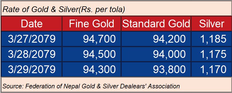 ज्ञानमाण्डू। नेपाली बजारमा आज सुनको मूल्य प्रतितोला २ सय रुपैयाँले घटेको छ । नेपाल सुनचाँदी व्यवसायी महासंघका अनुसार असार २९ गते, बुधबारका दिन छापावाला सुनको मूल्य तोलाको ९४ हजार ३ सय रुपैयाँ र तेजावी सुनको मूल्य प्रतितोला ९३ हजार ८ सय रुपैयाँ तोकिएको छ ।