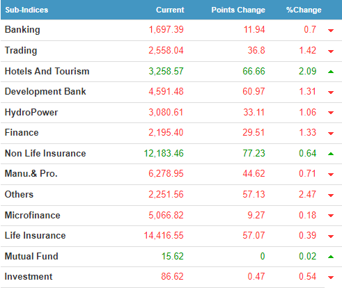 कारोबार भएका कूल १३ उपसमूहहरू मध्य होटल तथा पर्यटन उपसमूह ६६ दशमलव ६६ अङ्कले, निर्जीवन बीमा ७७.२३ अङ्कले र सामूहिक लागनी कोष शुन्य अङ्कले बढेको छ। यता, बैंकिङ उपसमूह ११ दशमलव ९४ अङ्कले घट्दा ट्रेडिङ उपसमूह ३६ दशमलव ८ अङ्कले, विकास बैंक उपसमूह ६०.९७ अङ्कले, जलविद्युत उपसमूह ३३.११ अङ्कले, वित्त उपसमूह २९.५१ अङ्कले, उत्पादन उपसमूह ४४.६२ अङ्कले, अन्य उपसमूह ५७.१३ अङ्कले, लघुवित्त उपसमूह ९.२७ अङ्कले, जीवन बीमा उपसमूह ५७.०७ अङ्कले र लगानी उपसमूह शुन्य दशमलव ४७ अङ्कले घटेका छन् ।