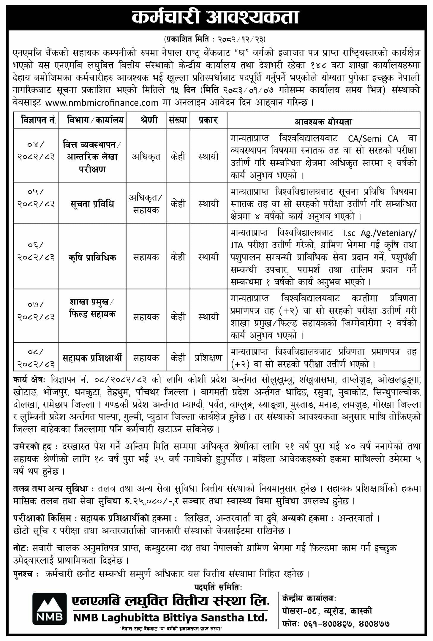 एनएमबि बैंकको सहायक कम्पनीको रुपमा नेपाल राष्ट्र बैंकबाट “घ” वर्गको इजाजत पत्र प्राप्त राष्ट्रियस्तरको कार्यक्षेत्र भएको एनएमबि लघुबित्त वित्तीय संस्थाको केन्द्रीय कार्यालय तथा देशभरी रहेका १४८ वटा शाखा कार्यालयहरुमा देहाय बमोजिमका कर्मचारीहरु आवश्यक भई खुल्ला प्रतिस्पर्धाबाट पदपूर्ति गर्नुपर्ने भएकोले योग्यता पुगेका इच्छुक नेपाली नागरिकबाट सूचना प्रकाशित भएको मितिले १५ दिन ( मिति २०८३ / ०१/ ०७ गतेसम्म कार्यालय समय भित्र ) आवेदन दिन आह्वान गरेकाे छ।