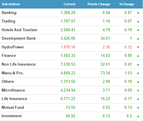 कारोबार भएका कूल १३ उपसमूह मध्य जलविद्युत उपसमूह २ दशमलव ३५ अङ्कले घटेकाे छ । बैंकिङ उपसमूह शुन्य दशमलव ९४ अङ्कले बढ्दा ट्रेडिङ उपसमूह १ दशमलव १६ अङ्कले, होटल तथा पर्यटन उपसमूह ४.७९ अङ्कले, विकास बैंक उपसमूह ३४.०१ अङ्कले, वित्त उपसमूह १४.०२ अङ्कले, निर्जीवन बीमा ३२.६१ अङ्कले, उत्पादन उपसमूह ७३.३४ अङ्कले, अन्य उपसमूह २.४९ अङ्कले, लघुवित्त उपसमूह ३.७१ अङ्कले, जीवन बीमा उपसमूह १५.२३ अङ्कले, सामूहिक लगानी कोष शुन्य दशमलव ०२ अङ्कले र लगानी उपसमूह शुन्य दशमलव १२ अङ्कले बढेको छ।