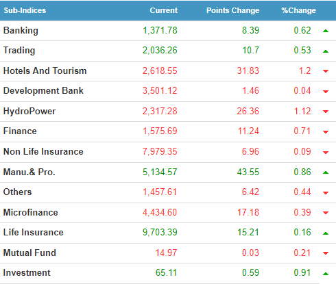 कारोबार भएका कूल १३ उपसमूह मध्य आठ उपसमूहको शेयर ओरालो लागेका छन् । बैंकिङ उपसमूह ८ दशमलव ३९ अङ्कले बढ्दा ट्रेडिङ उपसमूह १० दशमलव ७ अङ्कले, उत्पादन उपसमूह ४३.५५ अङ्कले, जीवन बीमा उपसमूह १५.२१ अङ्कले र लगानी उपसमूह शुन्य दशमलव ५९ अङ्कले बढेका छन् । यता, होटल तथा पर्यटन उपसमूह ३१ दशमलव ८३ अङ्कले, विकास बैंक उपसमूह १.४६ अङ्कले, जलविद्युत उपसमूह २६.३६ अङ्कले, वित्त उपसमूह ११.२४ अङ्कले, निर्जीवन बीमा ६.९६ अङ्कले, अन्य उपसमूह ६.४२ अङ्कले, लघुवित्त उपसमूह १७.१८ अङ्कले र सामूहिक लगानी कोष शुन्य दशमलव ०३ अङ्कले घटेकाे छ ।